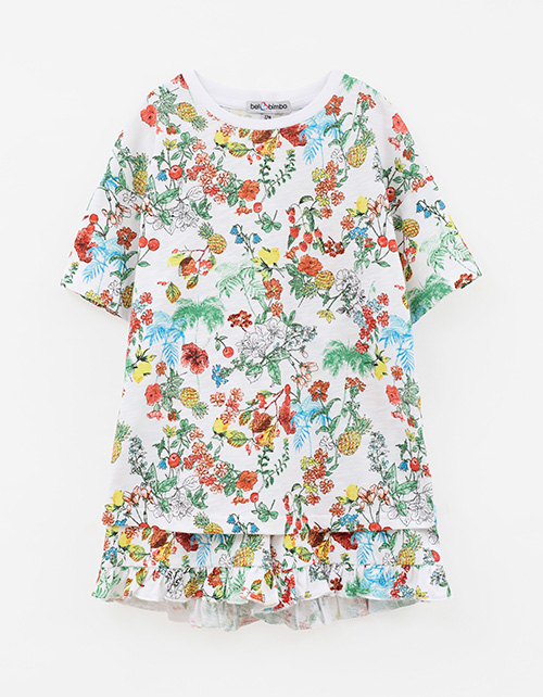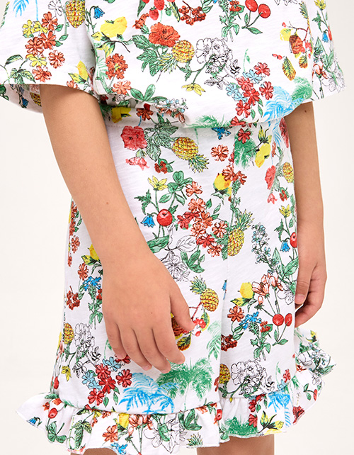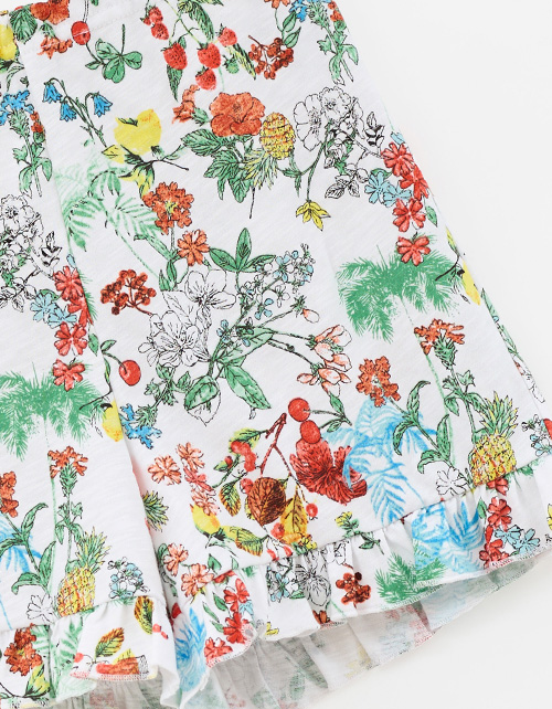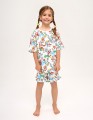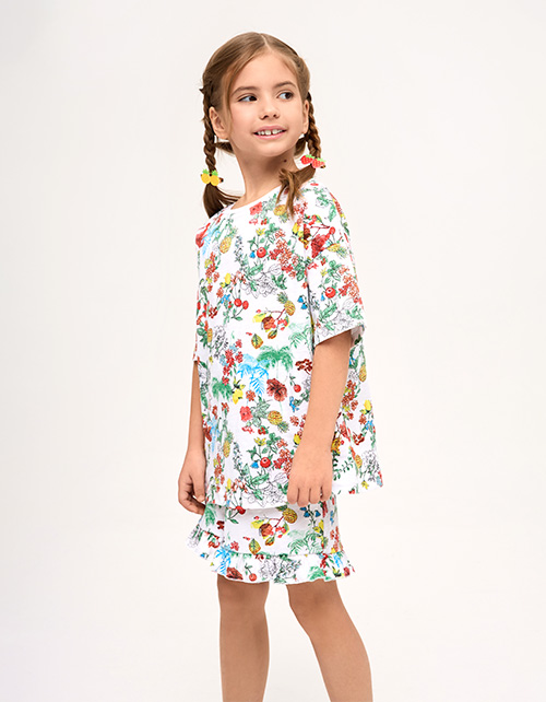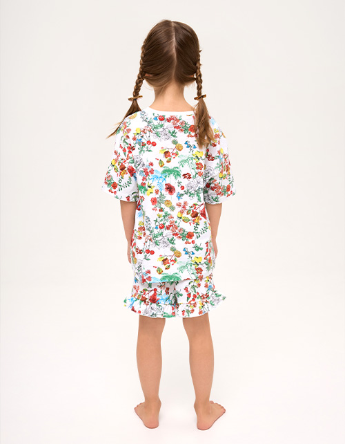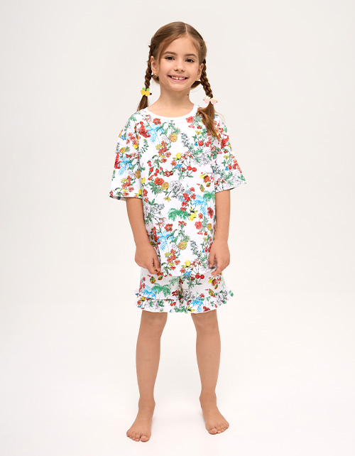 Пижамный сет из натурального хлопка для девочки: футболка и шорты с ярким принтом-садом. Сон в стиле мечты - мягкая ткань, эластичная горловина и лёгкие рюши дарят комфорт и свободу движений. Гипоаллергенный, дышащий, идеальный для сна и отдыха.