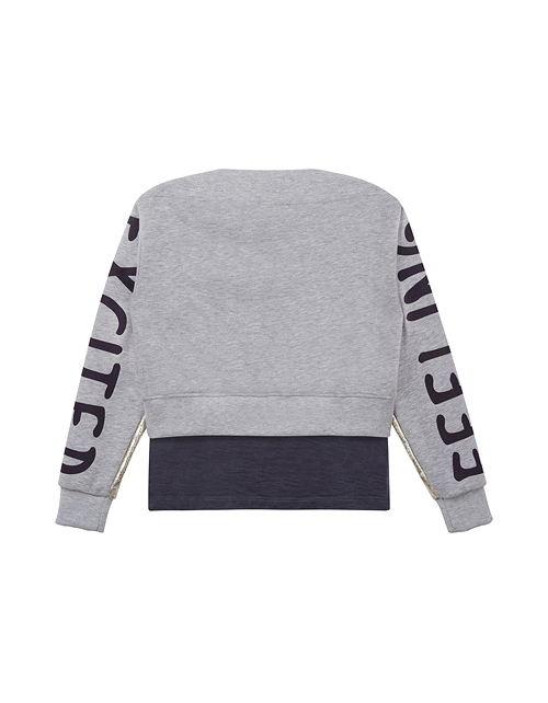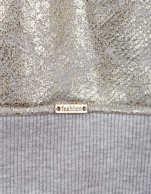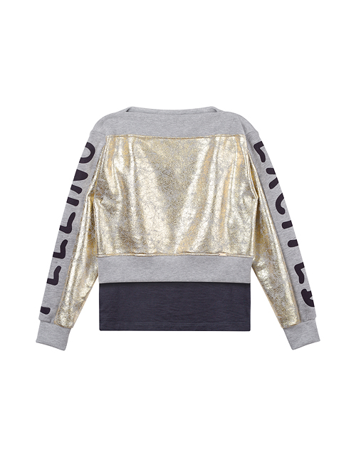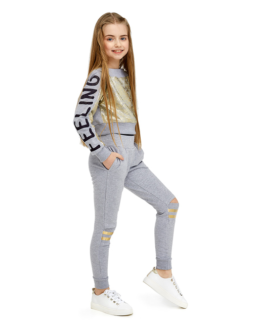 Стильный комплект состоит из укороченного свитшота и комфортной приталенной футболкой на изящных бретельках. Верхнее изделие декорировано вставками из мягкого полотна со сверкающей золотистой фактурой и актуальными графическими надписями на рукавах