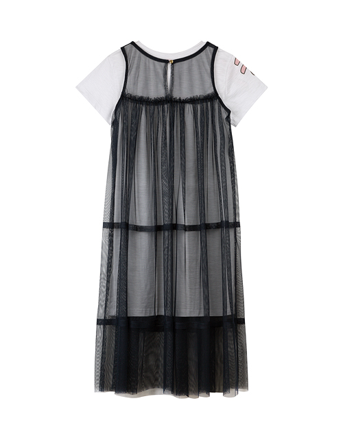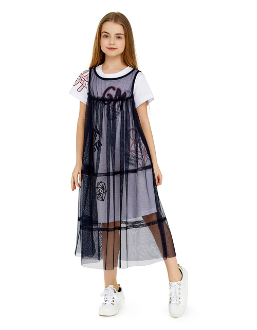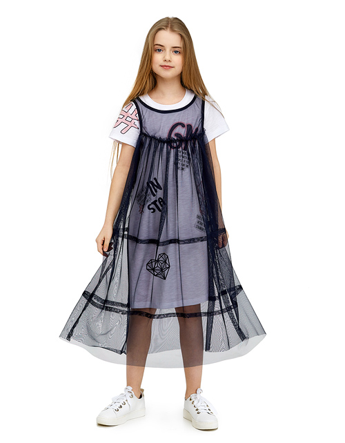 Яркий комплект создающий эффект трендовой многослойности. Укороченное платье-футболка декорировано актуальным молодёжным принтом. Верхнее платье выполнено из контрастного сетчатого полотна и придает образу лёгкость