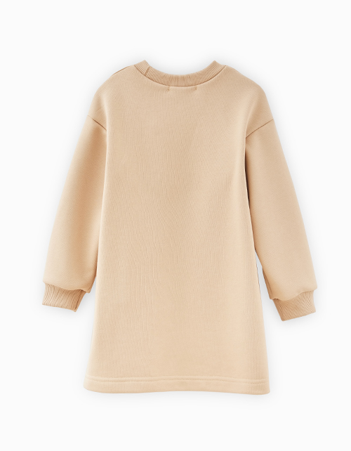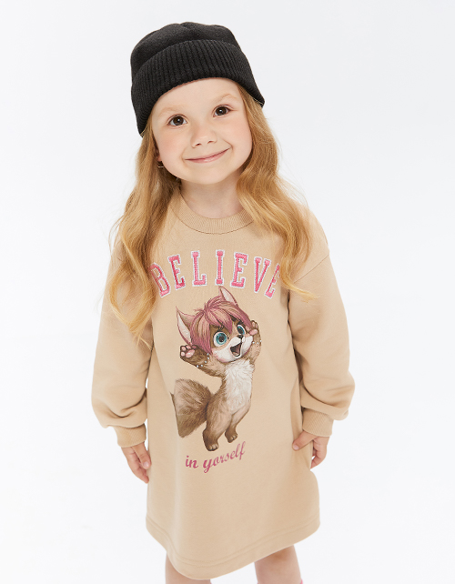 Стильное платье прямого силуэта выполнено в трендовом оттенке "сливочный латте". Модель декорирована тематическим принтом.