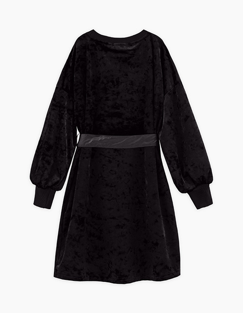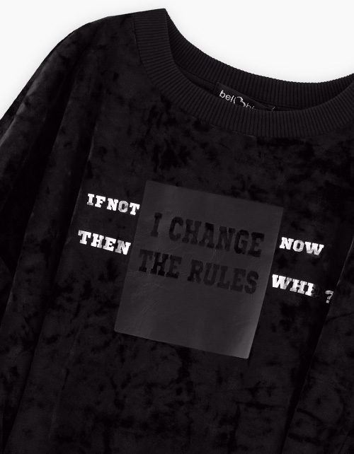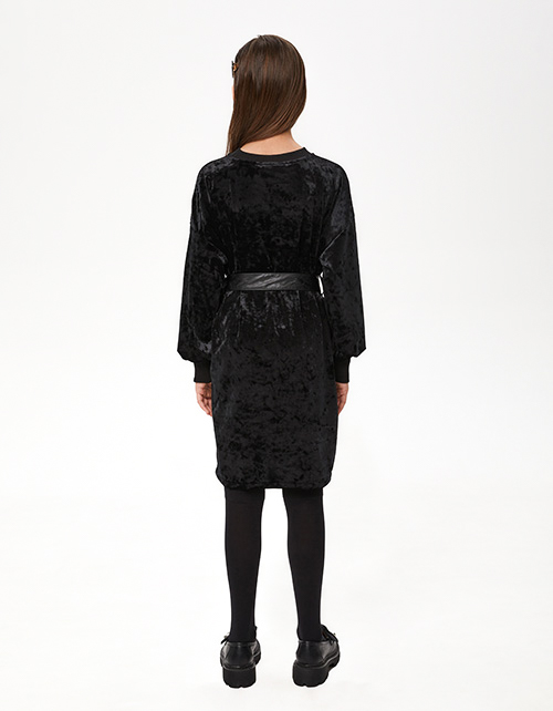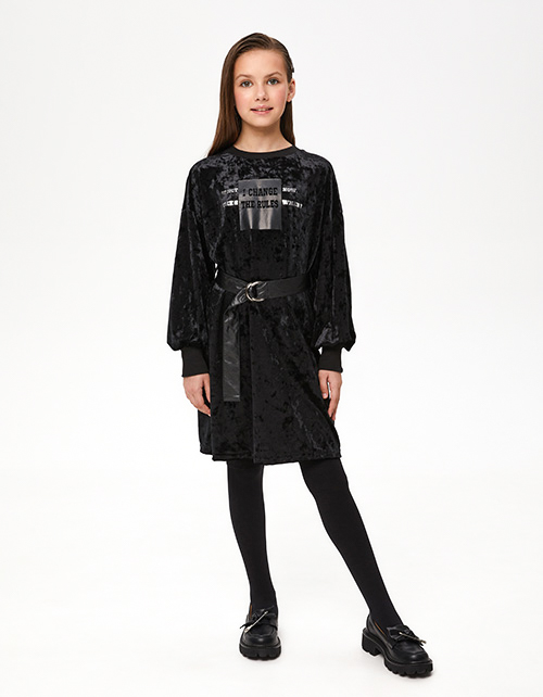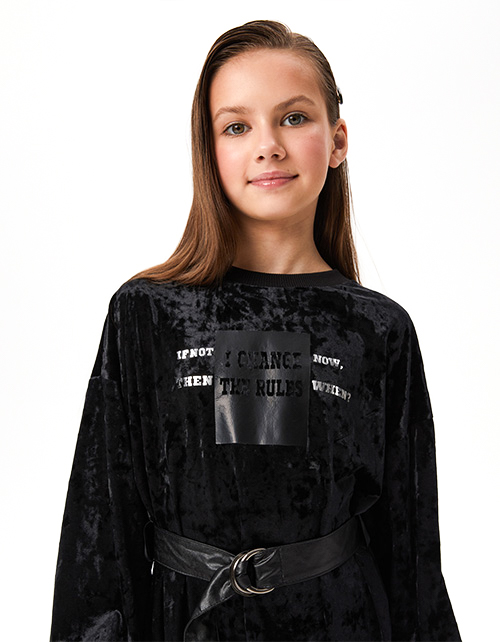 Стильное чёрное бархатное платье для девочки. Прямая объёмная модель. Изделие со съёмным ремнём из эко-кожи с металлическими полукольцами. Горловина и манжеты из эластичной рибаны. Платье дополнено авторской трансферной печатью.