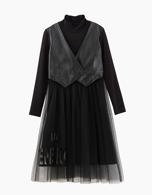 Стильное черное платье А-образного силуэта с длинным рукавом. Модель с эффектом из экокожи и пышной юбки.