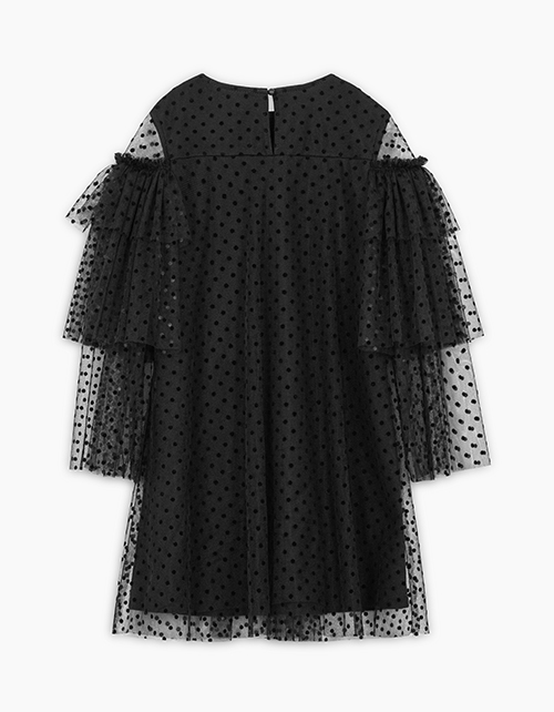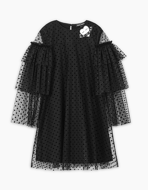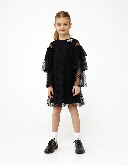 Стильное чёрное платье для девочки. Комфортный А-образный силуэт. Интересный трёхъярусный рукав из сеточки. Удобная застёжка на пуговицу в тон. Сочетание материалов: кулирная гладь и сетчатое полотно. Дизайнерская пришивная брошь с жемчужиной.