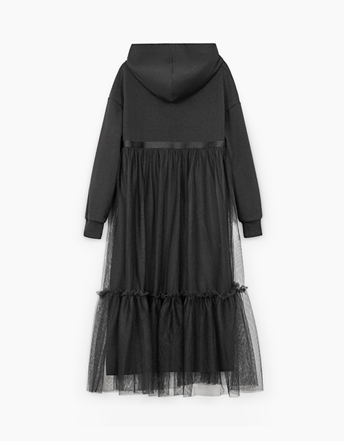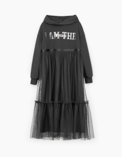 Чёрное нарядное удлинённое платье для девочки. Комфортная трапециевидная модель с капюшоном. Длинный рукав со спущенной линией плеча, низ из рибаны. Изделие из комбинации материалов: футер и сетчатое полотно. Платье с дизайнерским шрифтовым принтом.