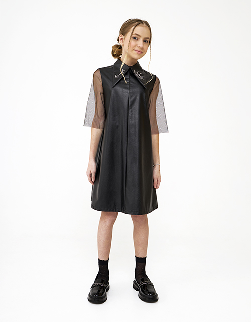 Стильное чёрное платье из эко-кожи для девочки. Комфортный трапециевидный силуэт. Длина до колена. Рукава из сетчатого полотна. Удобная застёжка на потайную молнию и пуговицу. Отложной воротник, декорированный трансферами из страз (око, стрелка).