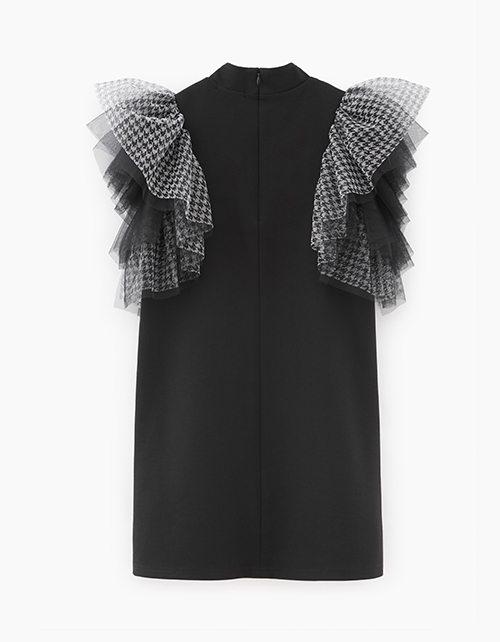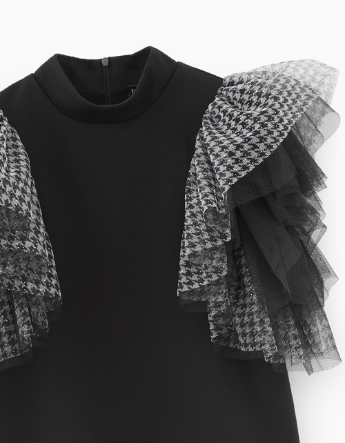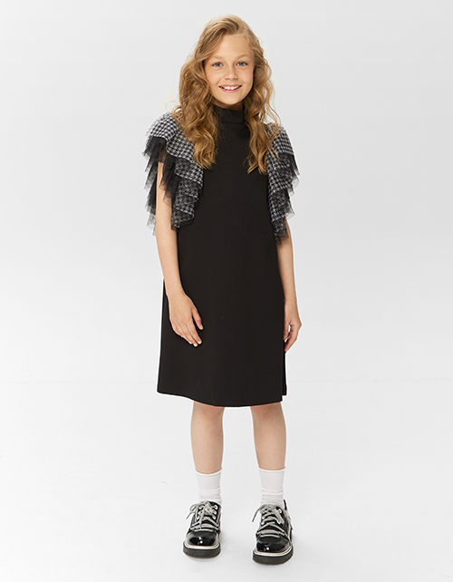 Стильное черное платье с акцентным коротким рукавом. Комфортная модель А-образного силуэта с застежкой на молнию.
