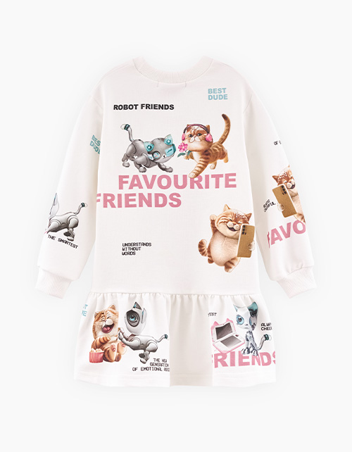 Дизайнерское платье оттенка молоко для девочки. Модель комфортного А-образного силуэта, сзади дополнительный романтичный волан. Приспущенная линия плеча. Горловина и манжеты из рибаны. Платье полностью декорировано авторскими принтами.