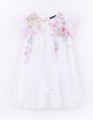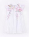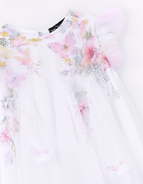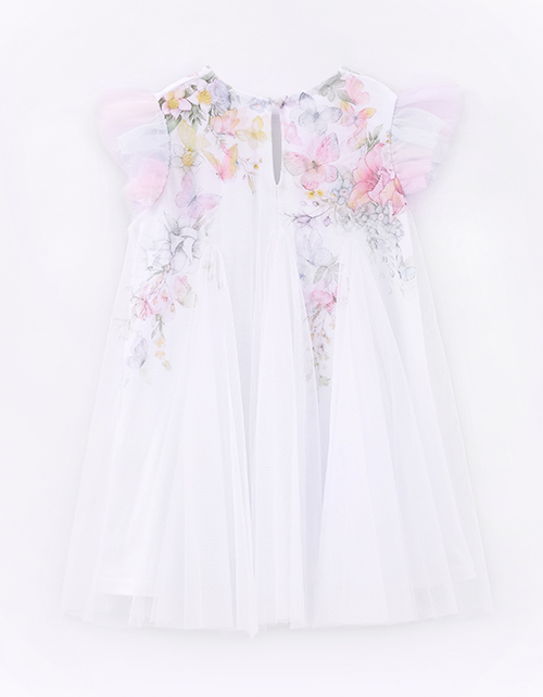 Белое дизайнесркое платье для особого случая для девочки. Комфортный А?образный силуэт с клиньями и лёгким сетчатым полотном создаёт воздушность. Радужные плечики и бабочки с пайетками добавляют яркости. Пуговичка на спинке - нежный акцент.