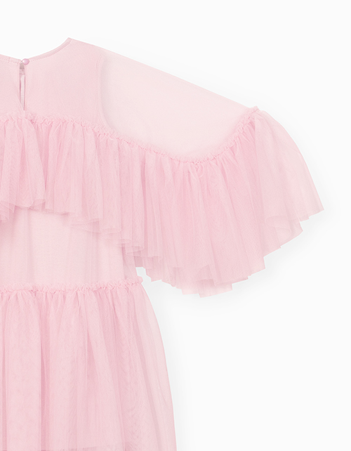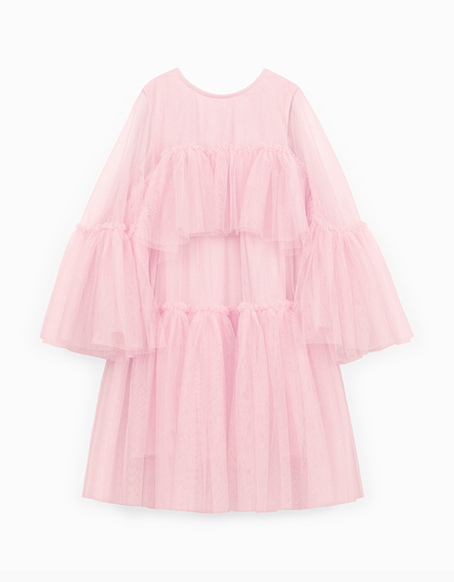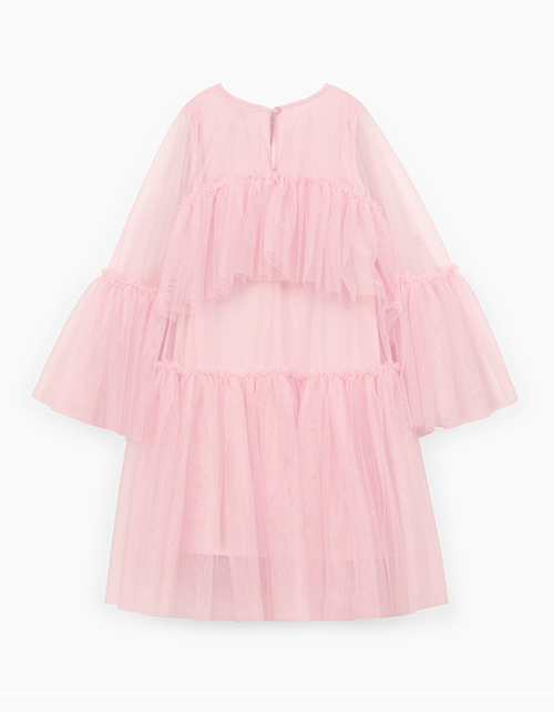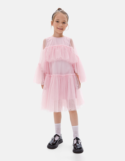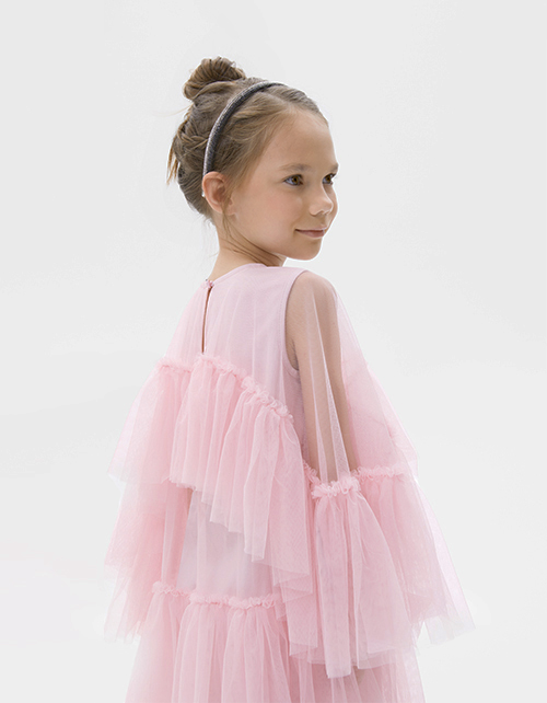 Дизайнерское светло-розовое нарядное платье для девочки. Комфортная трапециевидная модель с застёжкой на пуговицу. Изделие с оригинальной пелериной. Акцентные летящие рукава.