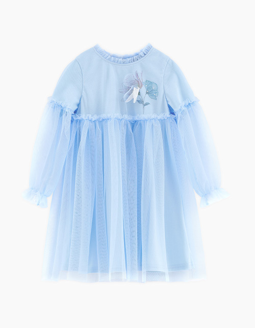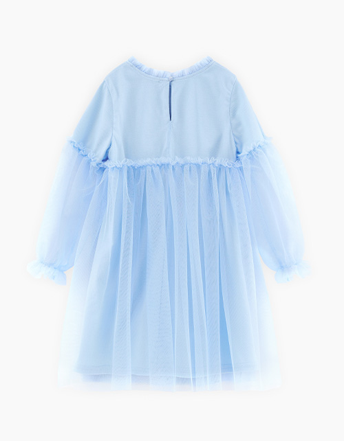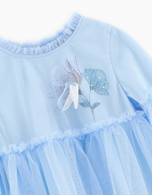 Нежное платье голубого оттенка для девочки. Модель комфортного А-образного силуэта. Застёжка на пуговицу. Комбинация материалов: кулирная гладь и мягкое сетчатое полотно. Платье декорировано цифровым авторским принтом, стразами и отлетными элементами.