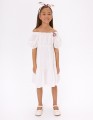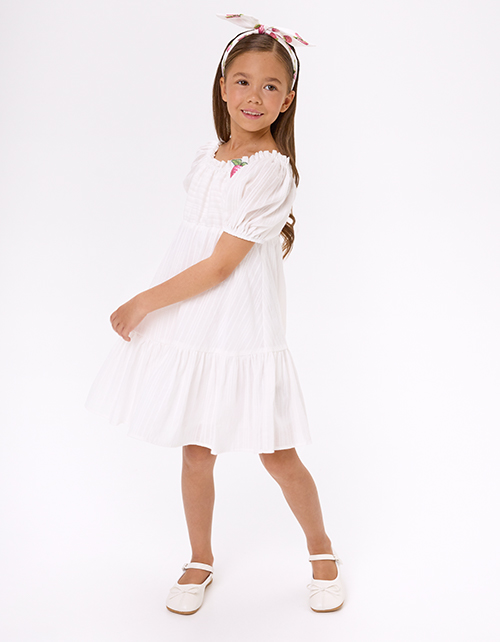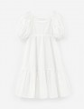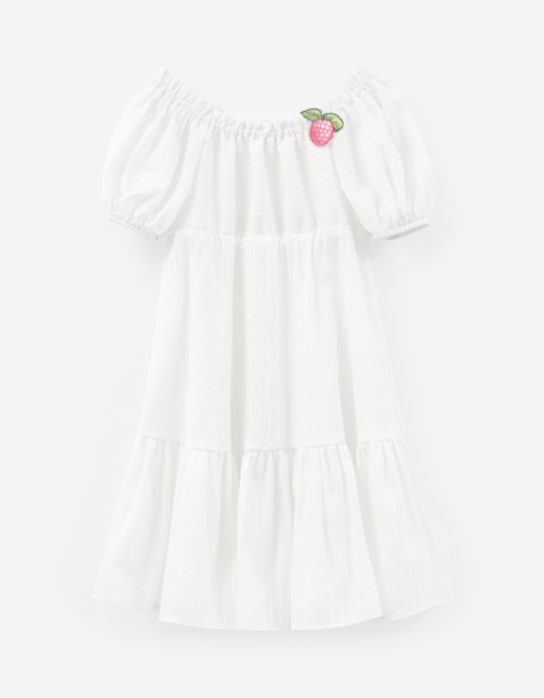 Молочное платье с А-силуэтом и вырезом каре создаёт лёгкий образ. Эластичная лента по горловине и по низу рукава добавляет комфорта. Нашивной элемент-малина выполнен как брошь. Спинка из натуральной кулирной глади, есть подкладка.