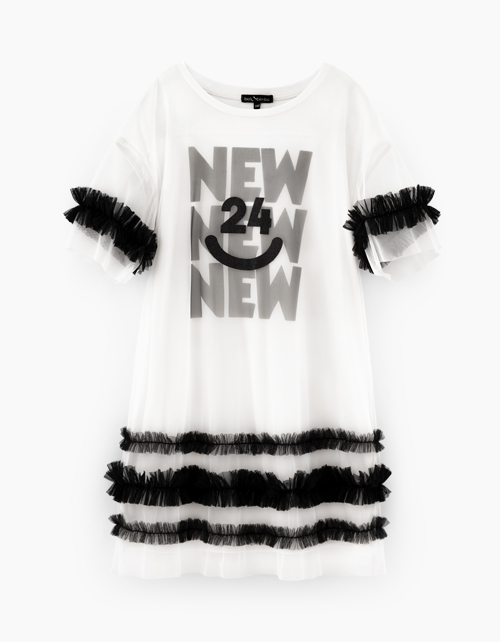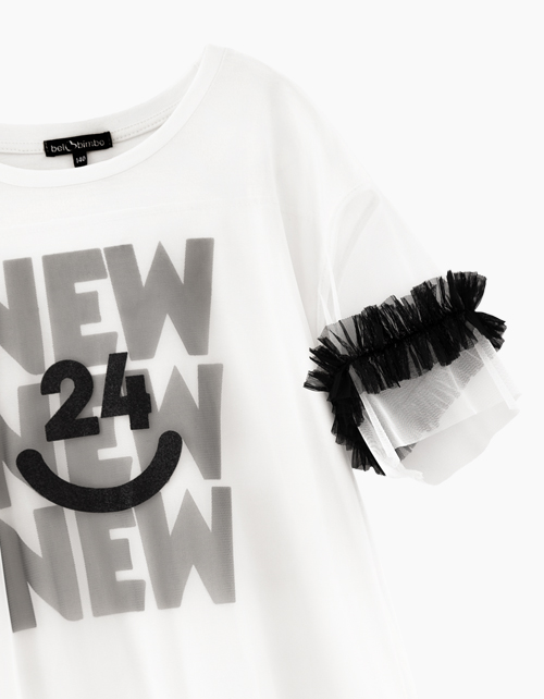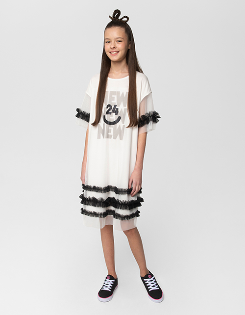 Нарядное молочное платье прямого силуэта. Модель с коротким рукавом. Платье декорировано принтом и рюшами.