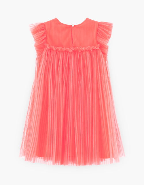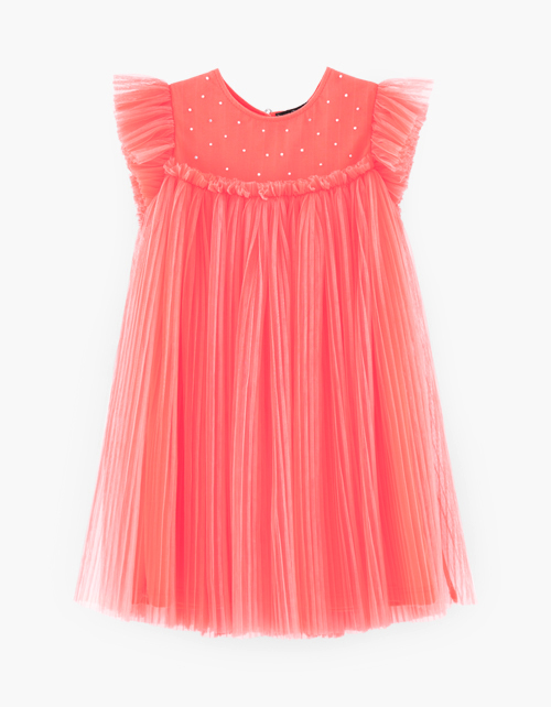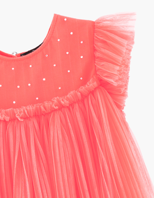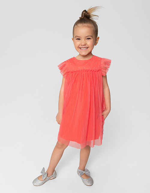 Стильное коралловое EVENT-платье с дизайнерским бантом. Модель А-образного силуэта с коротким рукавом. Застежка по спинке на пуговицу. Декорировано стразами.