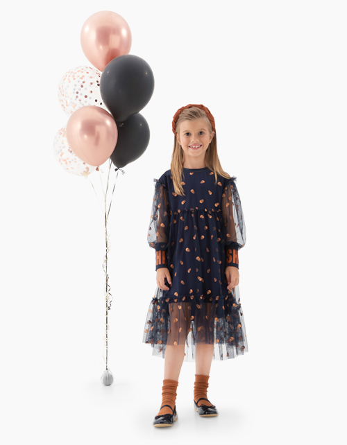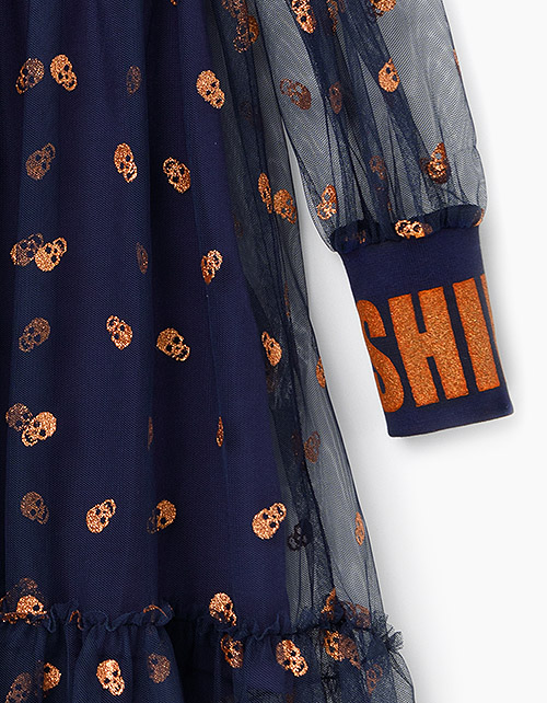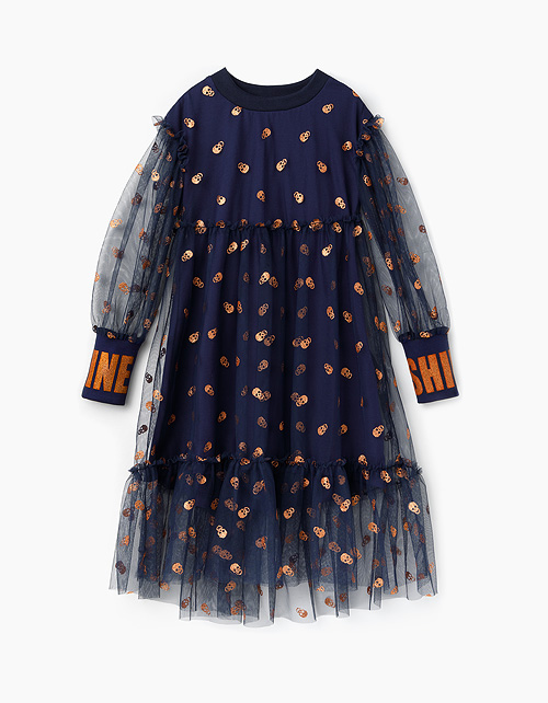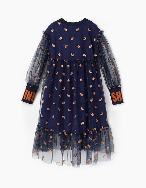 Нарядное платье А-силуэта с длинными рукавами-фонариками для девочки. Выполнено из сетчатого полотна с набивным рисунком в стилистике Хэллоуина. Подкладка из кулирной глади. Декорировано глиттерным принтом на манжетах