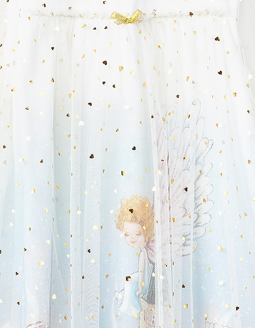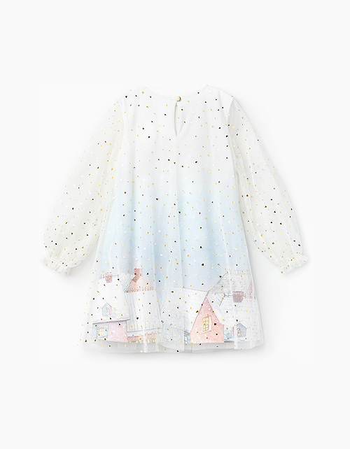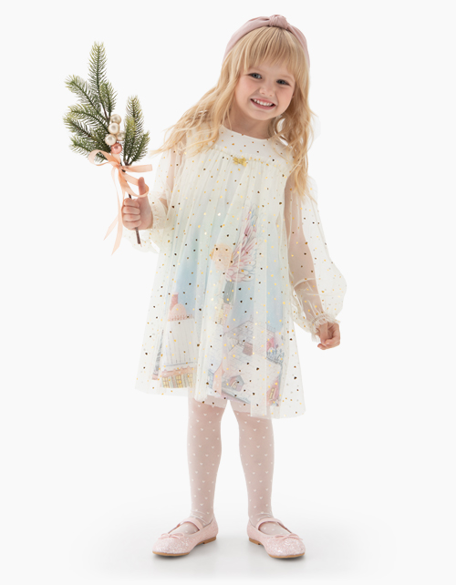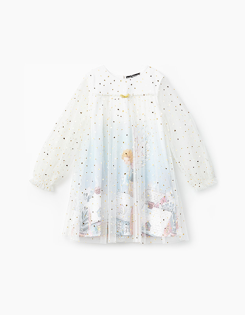 Легкое и воздушное платье А-силуэта из сетчатого полотна в золотые сердечки. Подкладка из мягкой кулирки декорирована нежным авторским принтом. Низ рукава собран на резиночку. Кокетка украшена бантиком из золотой тесьмы
