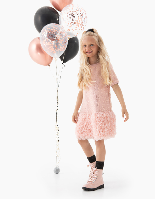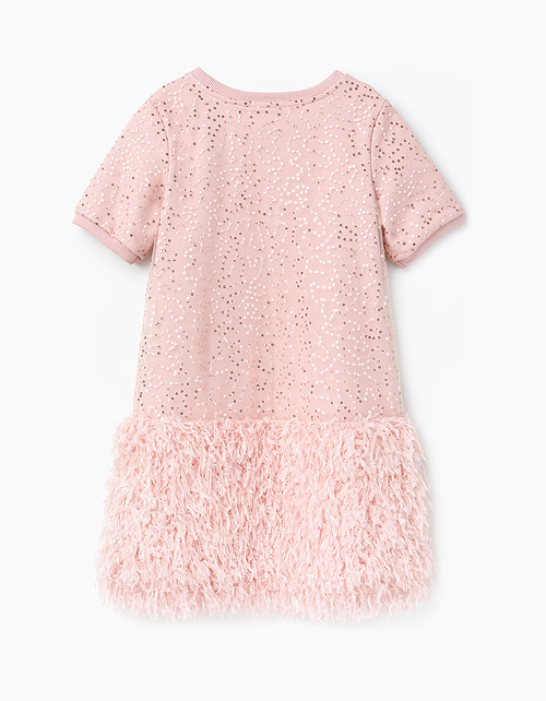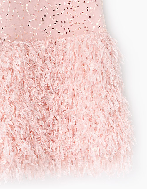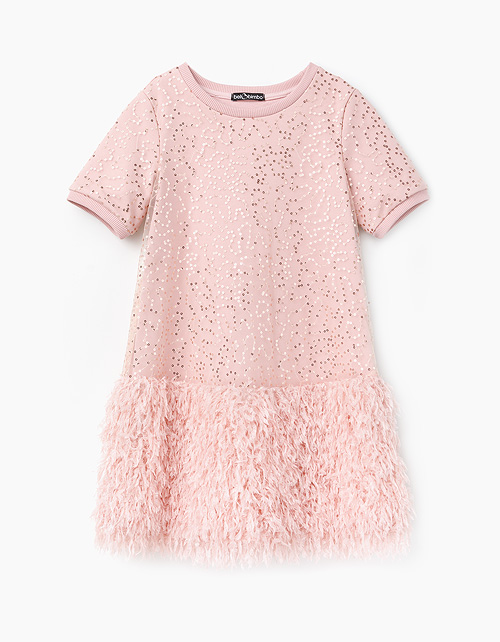 Нарядное платье с коротким рукавом из комбинации сетчатого полотна с пайетками и футера. Отделка из рибаны по горловине и рукавам. Трендовый акцент этого сезона - отрезная юбка из трикотажа, имитирующего перья