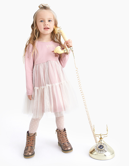 Темно-розовое нарядное платье с завышенной талией и оборкой на юбке выполнено из однотонного футера и сетки. Декорировано нежным принтом, стразами и аппликацией. Длинный присобранный по плечу рукав с россыпью страз. Удобная застежка на пуговицу.
