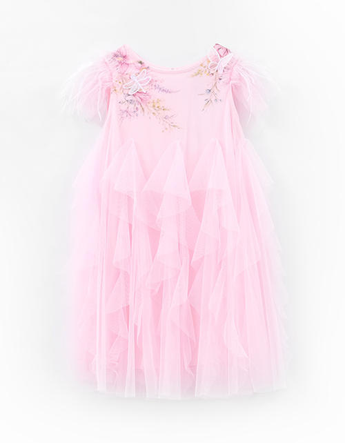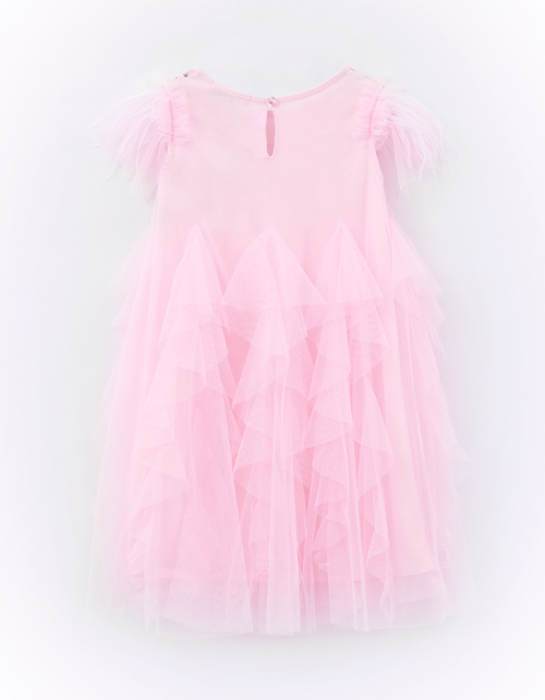 Дизайнерское платье для особого случая в ярком оттенке для девочки. Летящий А-образный силуэт из лёгкой ткани создаёт воздушность. Плечики с декоративными перьями, вышитые элементы с пайетками и пуговичка на спинке добавляют сияния.