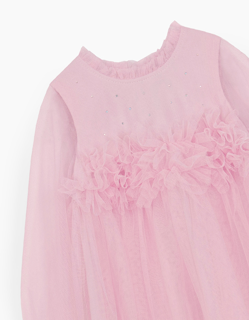 Нежное и летящее светло-розовое нарядное платье для девочки. Комфортная трапециевидная модель с фантазийными рукавами. Платье с застёжкой на пуговицу. Изделие декорировано стразами и декоративной рюшей по кокетке.
