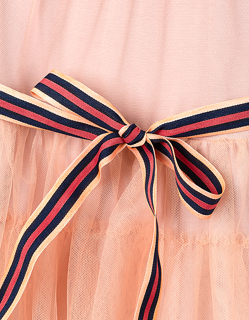 Яркое платье из лёгкой сеточки с модной многоярусной юбкой. Особую актуальность платью придаёт сочетание романтичного силуэта и элементов декора в спортивном стиле: шрифтового принта и контрастного пояса