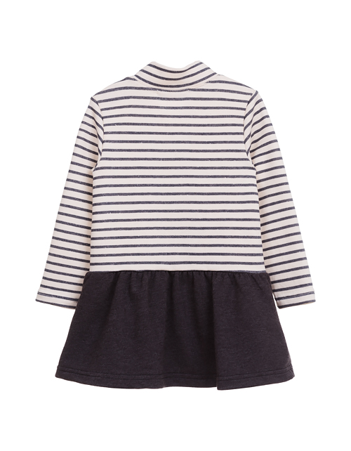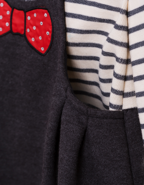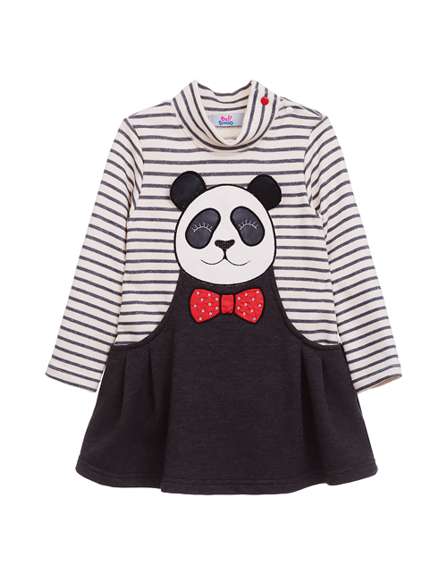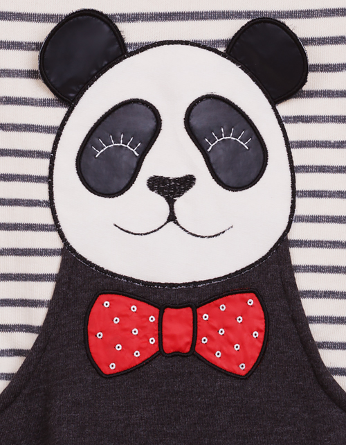 Свободное платье с карманами для маленьких модниц. Центральным "персонажем" является панда - мишка с ярким, расшитым пайетками бантом. Контрастные верх в полоску и темный низ смотрятся стильно. Супермягкие материалы позволят малышке чувствовать себя уютн