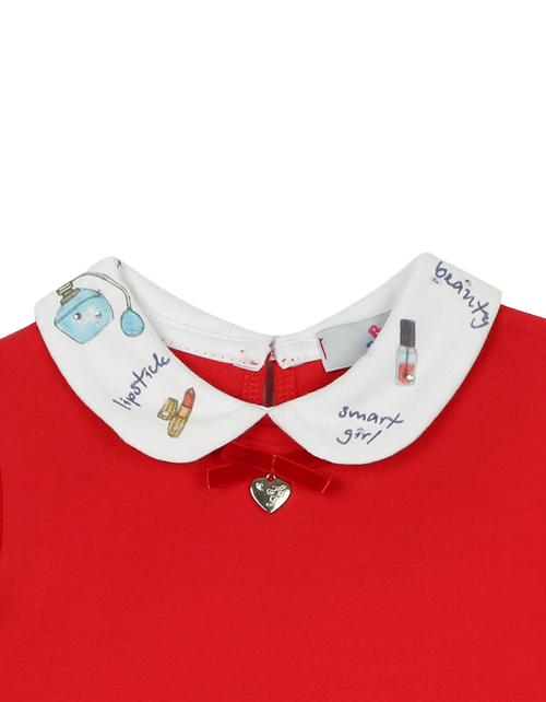 Красное платье для девочки свободного силуэта имеет отрезную заниженную талию, а юбка и воротничок выполнены из контрастной ткани с рисунком мишками. Сзади есть застежка на молнии, а на рукавах удобные манжеты. Изделие пошито из приятного к телу футера.