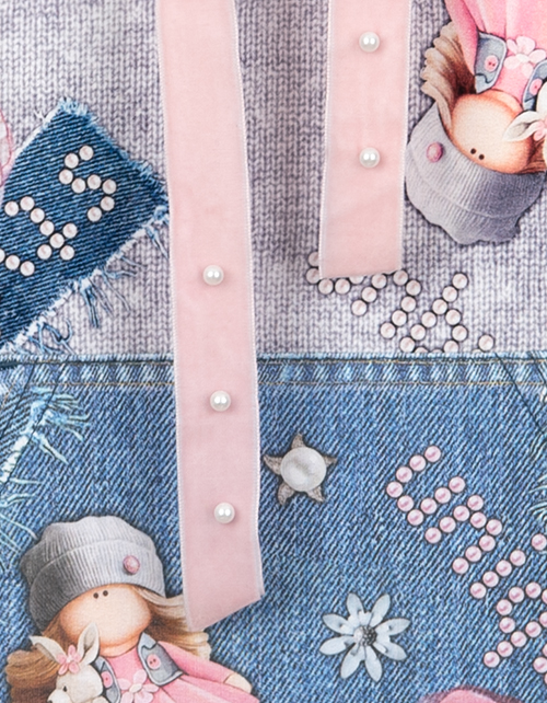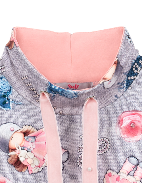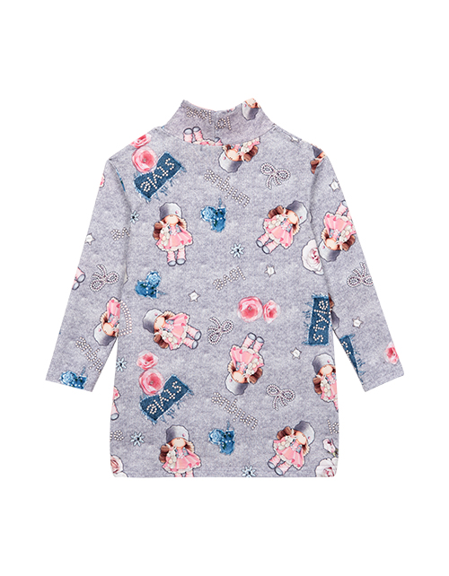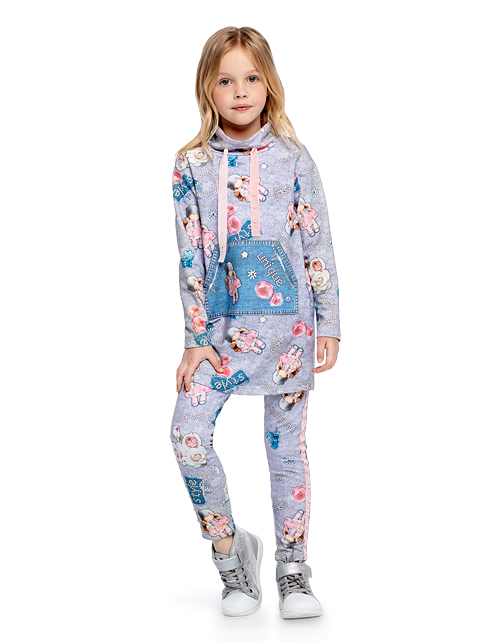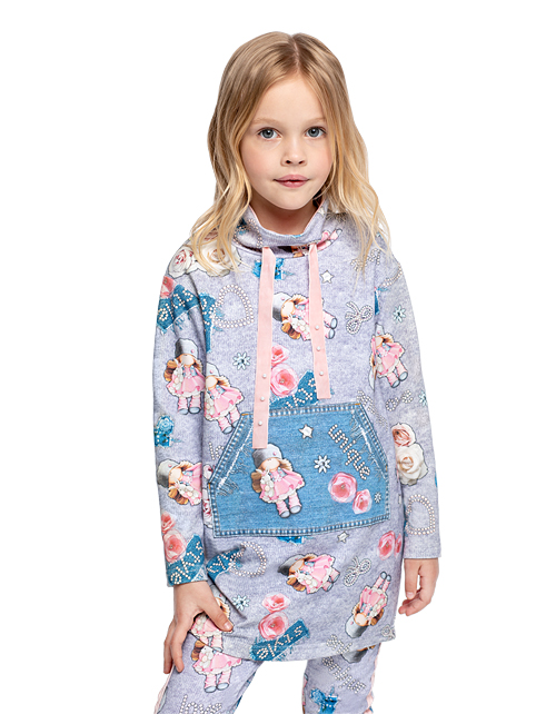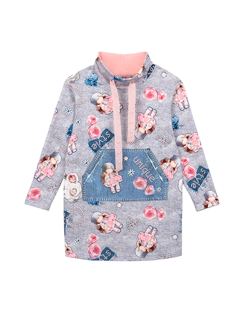 Теплое платье для девочки в спортивном стиле имеет прямой силуэт и стильный дизайн. Изделие дополнено модным принтом, воротником стойкой с шнурком-затяжкой и карманом кенгуру. Платье из футера приятное к телу и комфортное в носке
