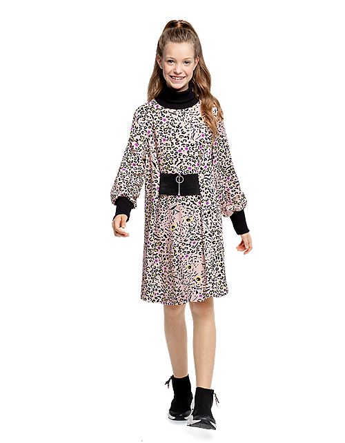 Платье для девочки свободного силуэта дополнено контрастным высоким воротником, манжетами на рукавах и вставкой в районе пояса из рибаны с декоративной молнией. Ткань плательная из 100% вискозы гарантирует приятные тактильные ощущения и комфорт в носке.
