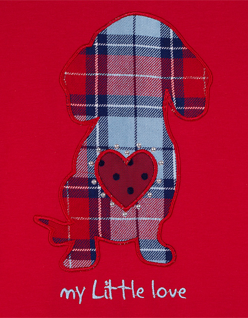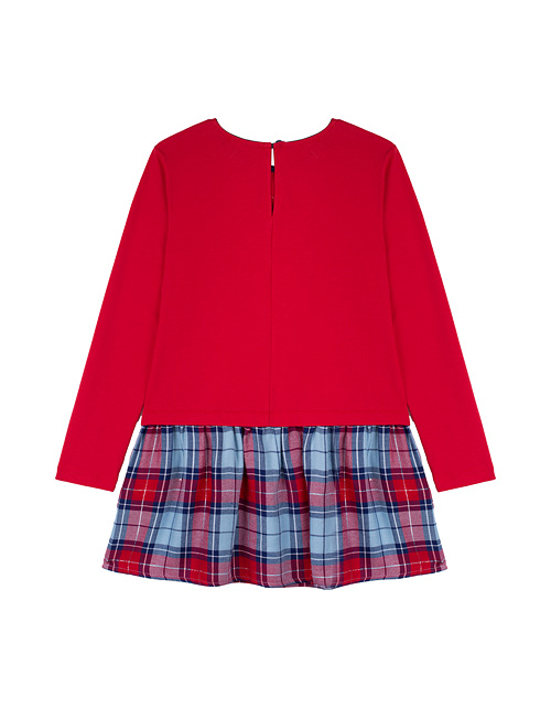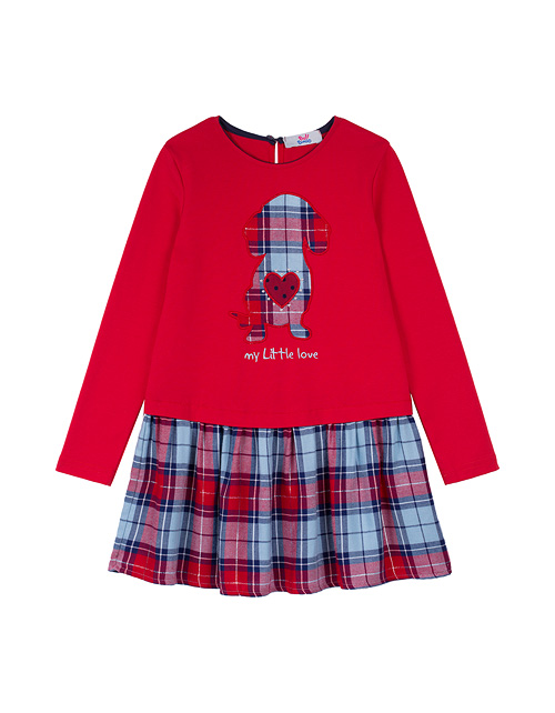 Платье для девочки свободного силуэта с рисунком собаки и юбкой в клетку имеет длинный рукав, круглый вырез горловины и заниженную линию талии. Трикотажная ткань кулирная гладь износостойкая и дарит комфорт в носке.