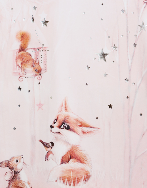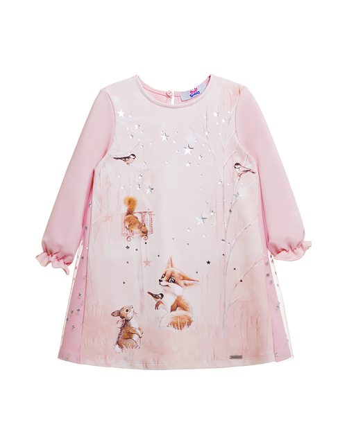 Платье с пушистыми зверюшками и волшебными звездочками. Мягкая "девчачья" цветовая гамма, рюши на рукавах, летящая тончайшая сеточка, космический блеск глиттера и милые лесные персонажи позволят Вашей девочке быть самой очаровательной в любой ситуации.