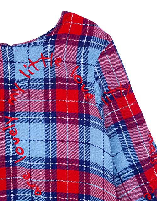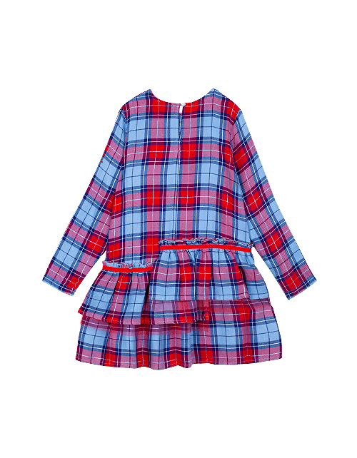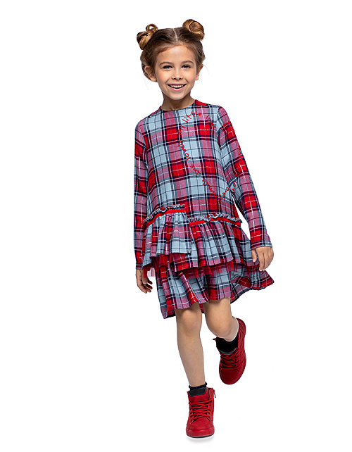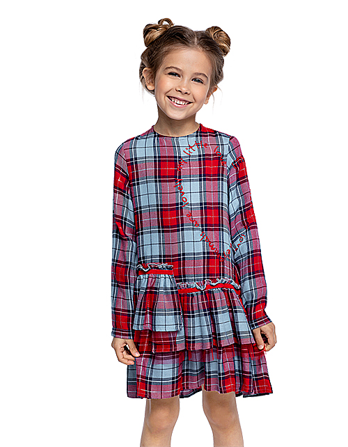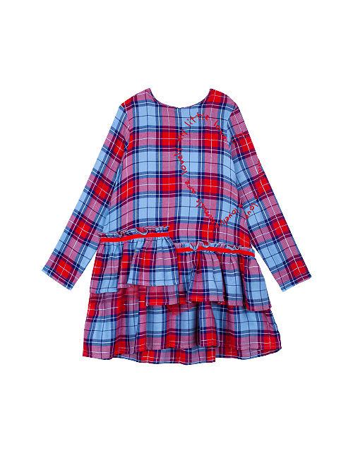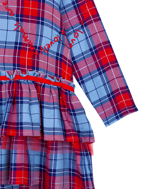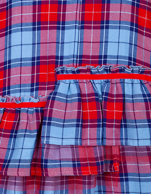 Платье для девочки в красно-голубую клетку свободного силуэта имеет круглый вырез горловины и длинный рукав, юбка украшена оборками с кантом. Изделие имеет вышивку в виде сердца. Мягкая вискозная ткань гарантирует приятные тактильные ощущения и комфорт.