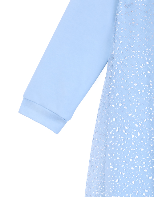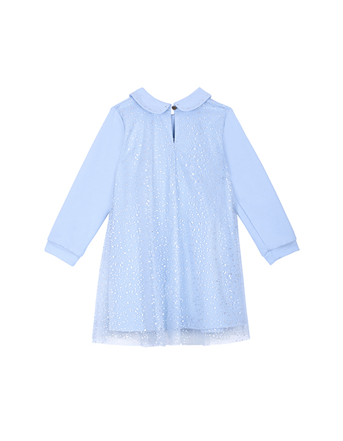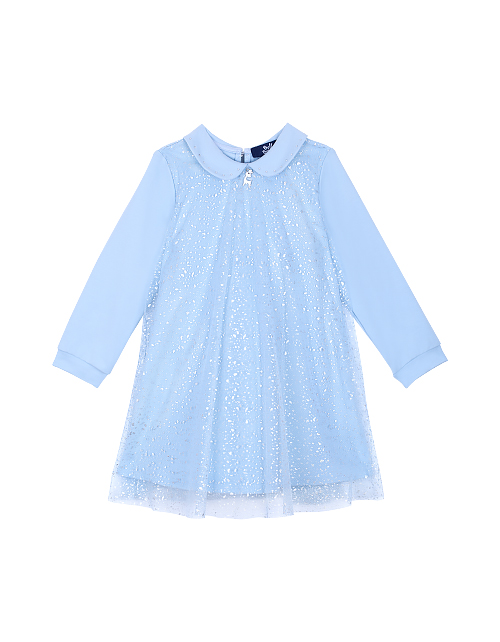 Нарядное платье для девочки а-силуэта дополнено круглым воротничком, застежкой на пуговицу и манжетами на рукавах. Отделка платья сетчатым полотном придает изделию легкость и воздушность. Приятная к телу ткань футер дарит комфорт в носке.
