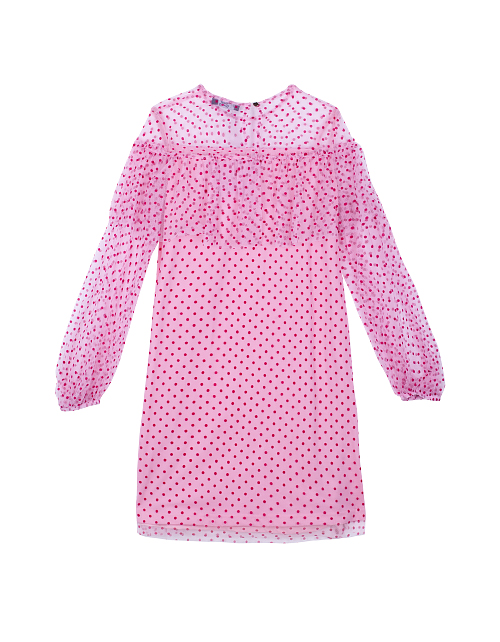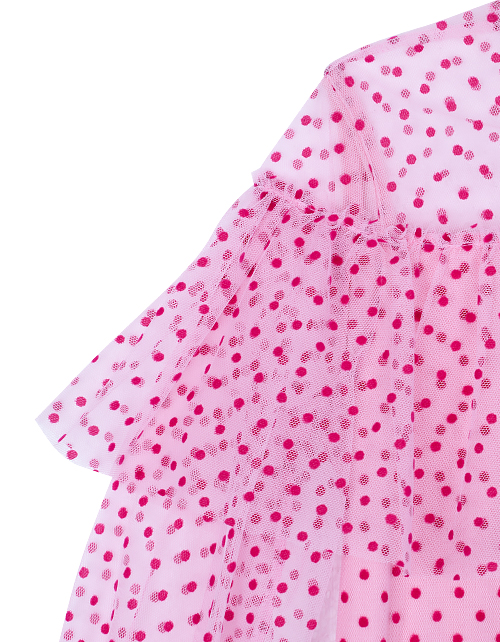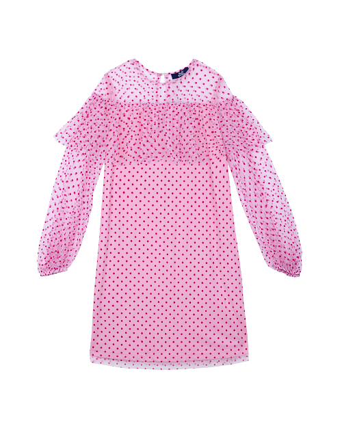 Нарядное платье для девочки а-силуэта с круглым вырезом горловины дополнено манжетами на рукавах и широкой оборкой на груди. Сетчатое полотно придает изделию невесомый вид, а подкладка из ткани кулирная гладь гарантирует приятные тактильные ощущения.
