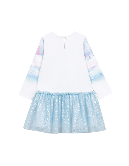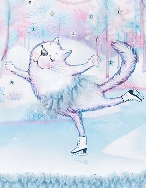 Нарядное трикотажное платье для девочки дополнено нежным принтом с кошкой на коньках с отлетным элементом. Изделие имеет свободный силуэт, длинный рукав,отрезную заниженную талию и круглый вырез горловины. Юбка отделана сетчатым полотном с пайетками.