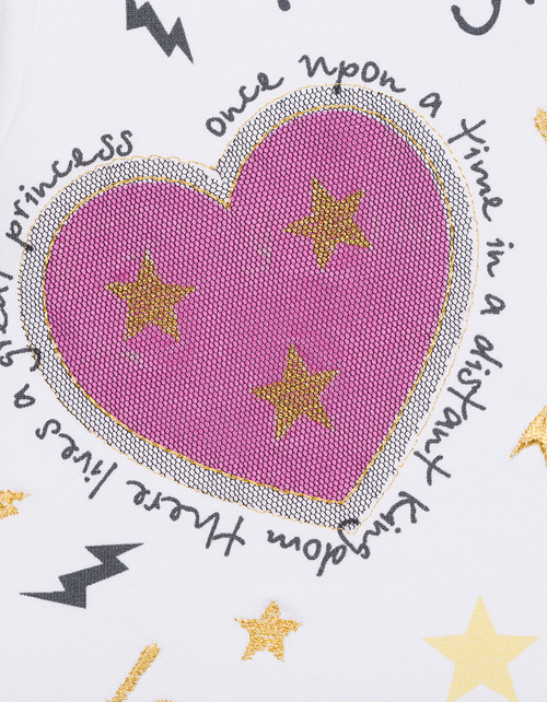Платье для девочки с юбкой имеет заниженную отрезную талию и принт с сердцем и единорогом. Свободный силуэт и застежки кнопки делают платье удобным в носке. Изделие пошито из приятного к телу футера, а юбка дополнена контрастным сетчатым полотном.