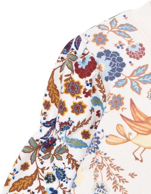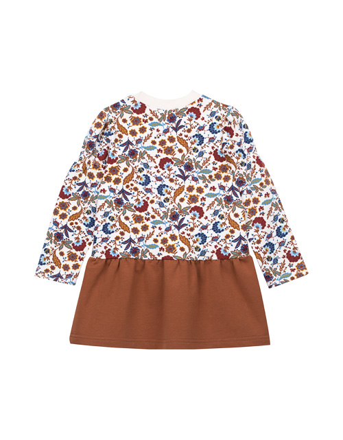 Платье для девочки с юбкой дополнено растительным принтом с птичками, стильной надписью и вышивкой на юбке. Изделие имеет длинный рукав, заниженную отрезную талию и круглый вырез горловины. Ткань футер дарит повышенный комфорт и удобство в носке.
