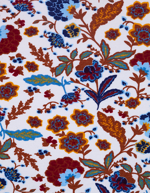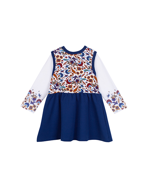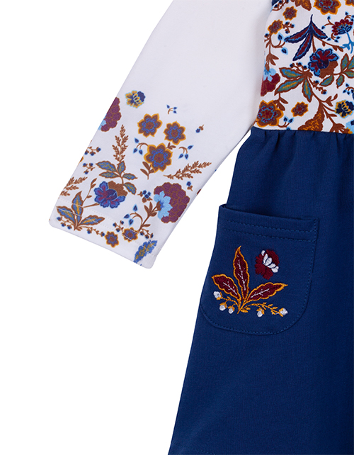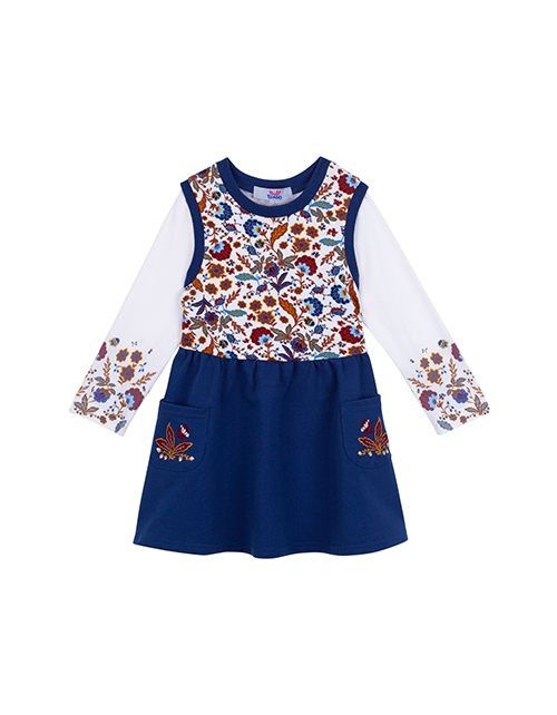 Платье для девочки имеет эффект многослойности за счет контрастного цвета рукавов и отделки горловины и проймы. Растительный принт есть на верхней части платья и рукавах, а два накладных кармана украшены вышивкой. Ткань футер мягкая и приятная на ощупь.