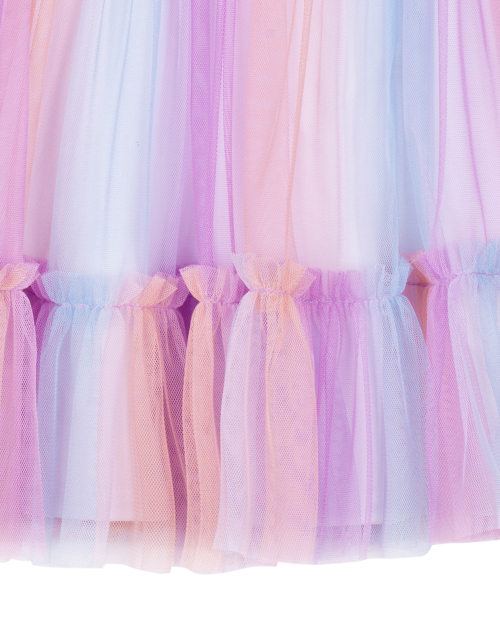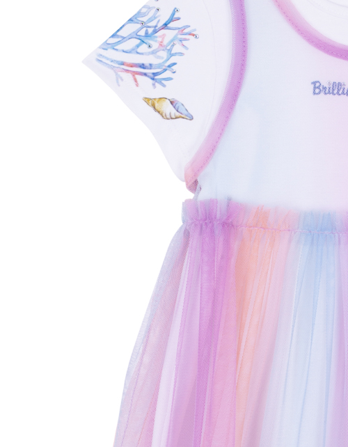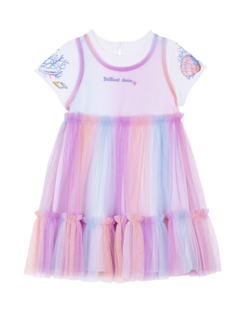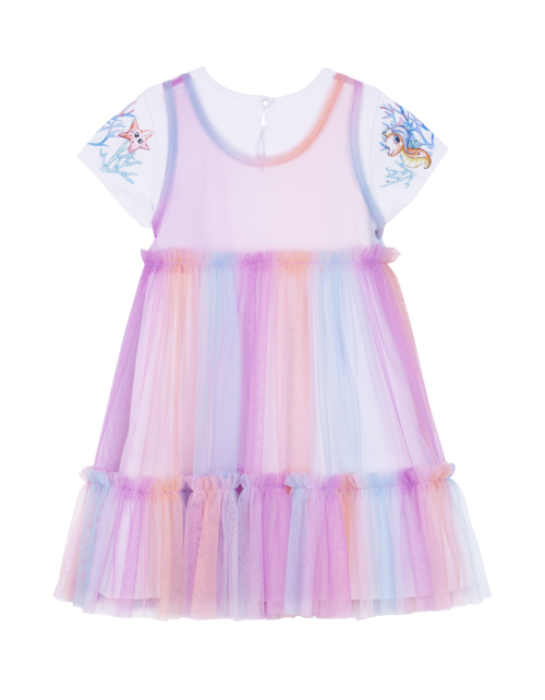 Нарядное платье для девочки а-силуэта из футера с завышенной линией талии. Короткий рукав, круглый вырез горловины и застежка на пуговице на спинке. Стильный принт, отделка из сетчатого полотна, стразы.