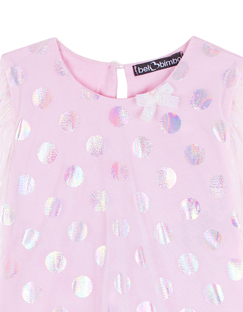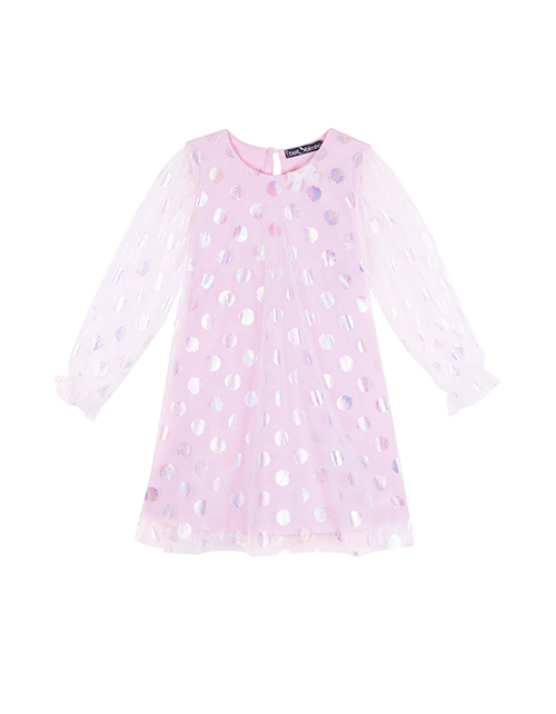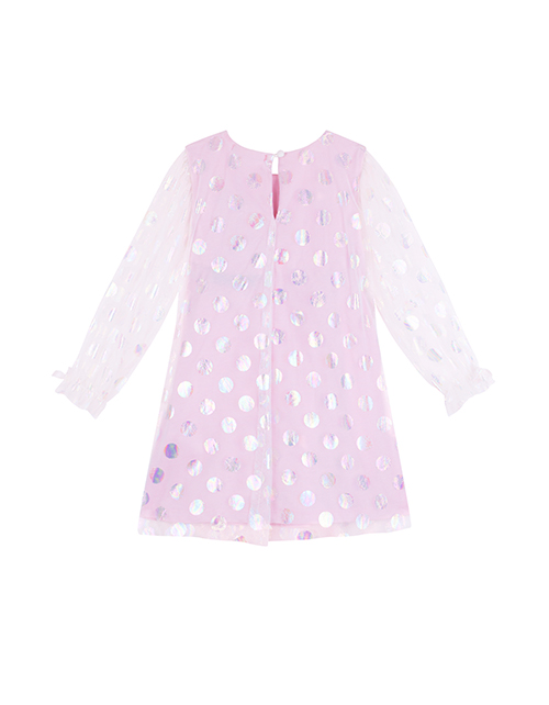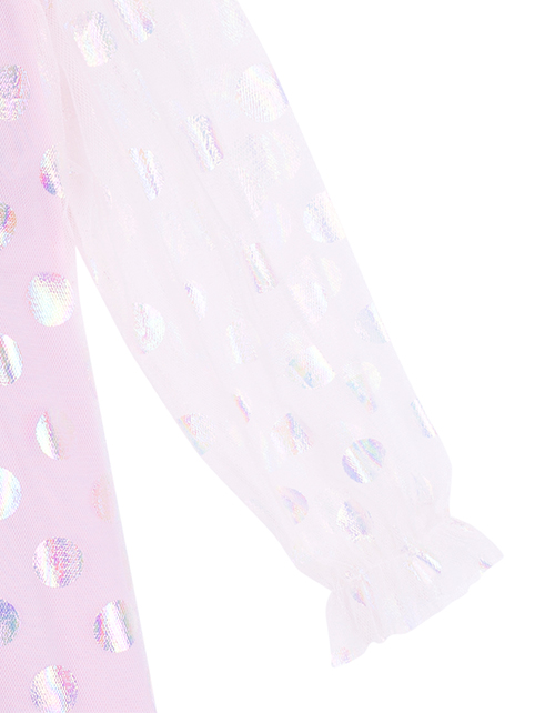 Платье для девочки в горохи со средним рукавом и круглым вырезом горловины. Трапециевидный силуэт. Полупрозрачные рукава со сборкой и пришивными бантами. Вставка из страз. Оформление в стилистике капсулы "Event".