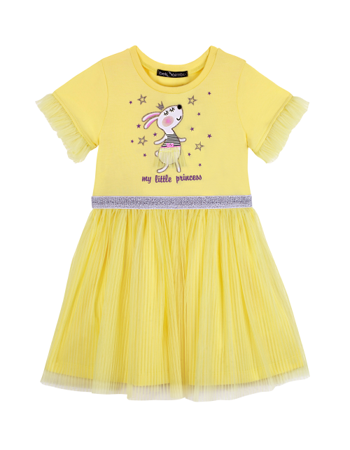 Светло-желтое платье для девочки трапециевидного силуэта. Короткий рукав и круглый вырез горловины. Юбка и рукава из сетчатого полотна со сборками. Верх и низ изделия соединены мягкой люрексовой лентой. Дизайнерское оформление в стилистике капсулы "Event