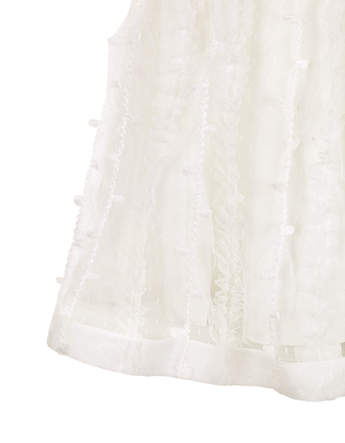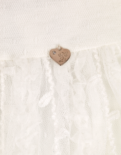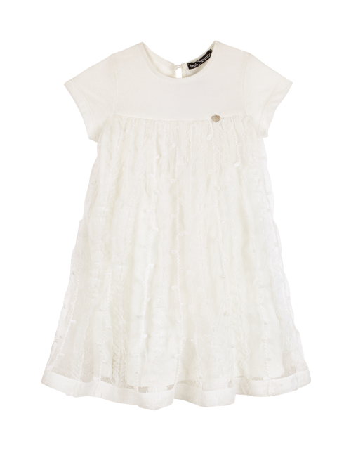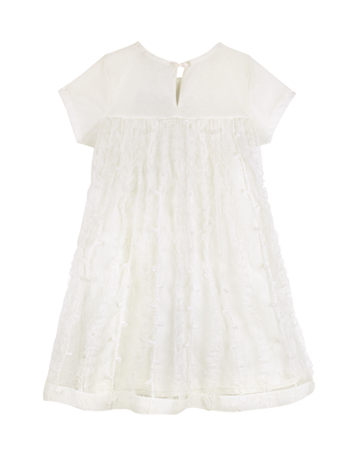 Молочное платье трапециевидного силуэта с завышенной талией. Застежка на пуговицу на спинке. Юбка из сетчатого полотна с использованием страз. Оформление в стилистике капсулы "Event".