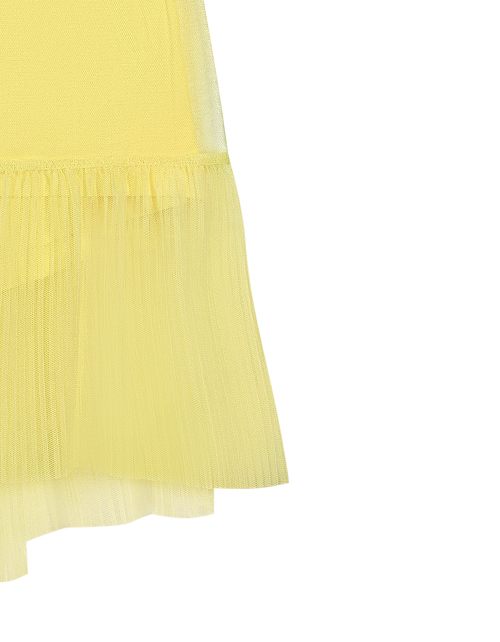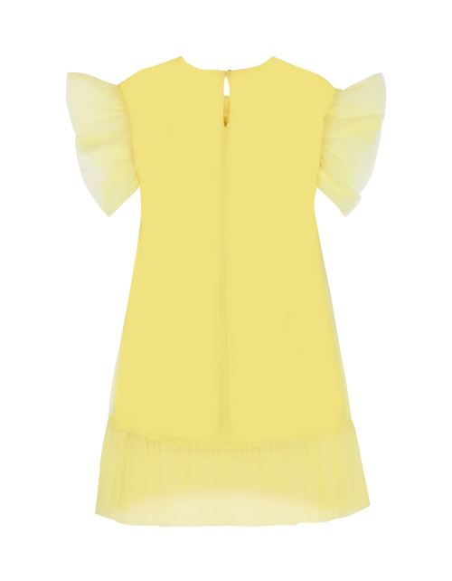 Светло-желтое платье для девочки трапециевидного силуэта ниже колена. Рукава-крылышки, нашивка из репсовой ленты с жемчугом. Дизайнерское оформление в стилистике капсулы "Event".