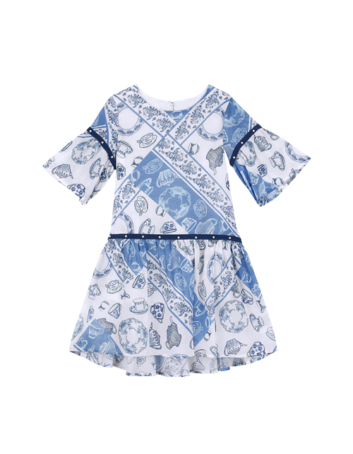 Набивное платье для девочки А-образного силуэта. Рукав с оборкой. Декор в виде киперной тесьмы и бусин "жемчуг". Оформление в стилистике капсулы "Чаепитие в саду".