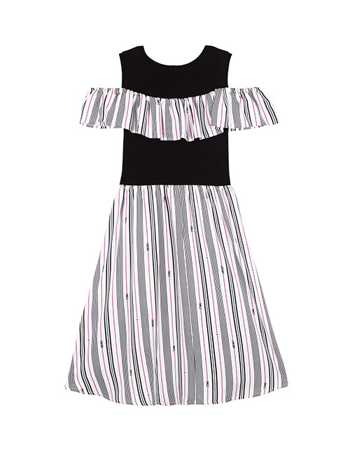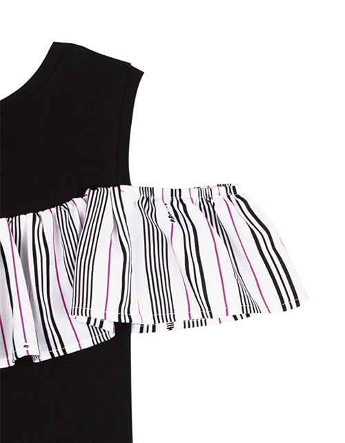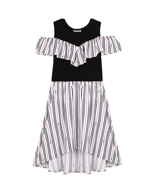 Отрезное по линии талии комбинированное платье для девочки в полоску. Открытые плечи, волан, удлиненная спинка. Дизайнерское оформление в стилистике капсулы "На своей волне".