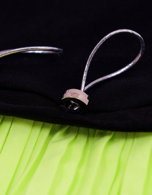 Платье для девочки с коротким рукавом и круглым вырезом горловины. Верх черного цвета с принтом в стилистике капсулы "Кот-Арт". Плиссированная юбка лимонного цвета.