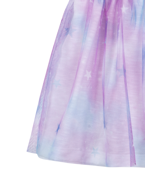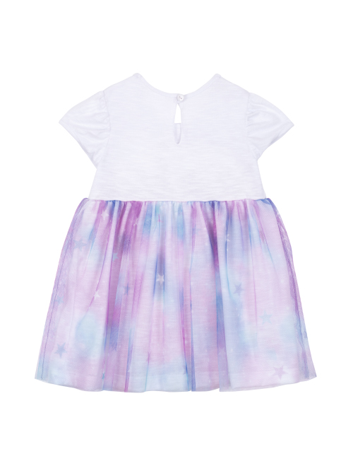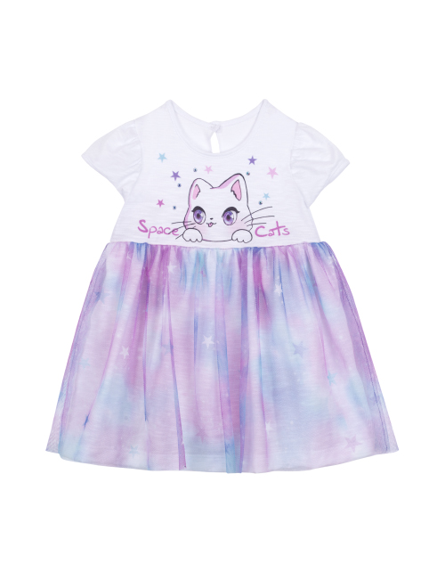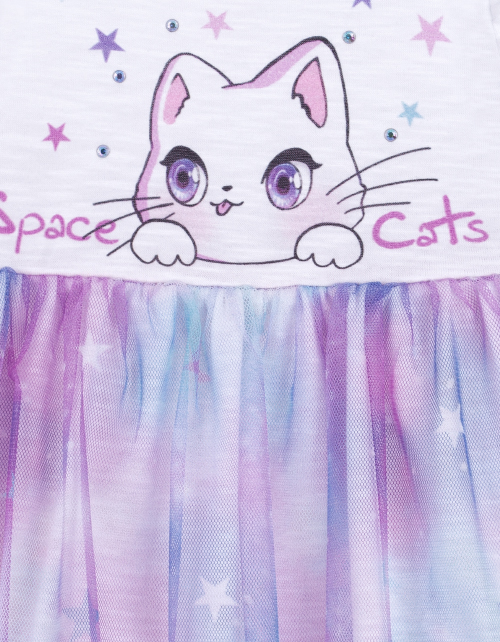 Платье с коротким рукавом для девочки. Юбка оформлена в стиле "Space Cat" и отделана сетчатым полотном. Принт и стразы на лицевой стороне платья. На спине присутствует застёжка на пуговице.