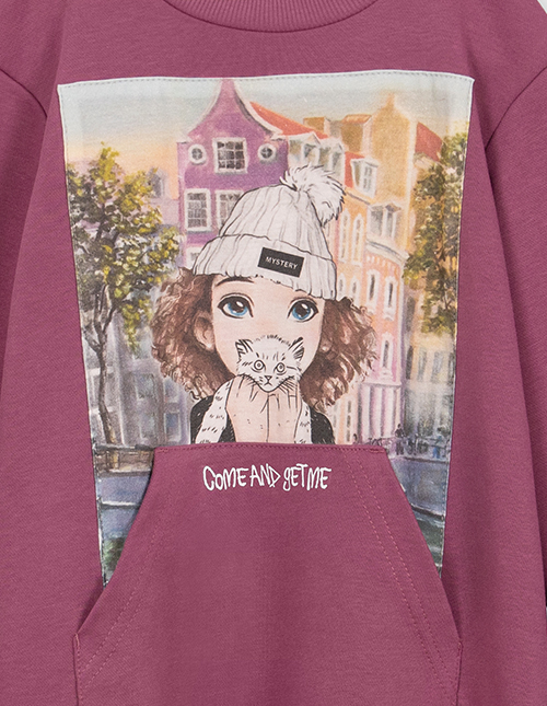 Модное платье А-образного силуэта с длинным рукавом в благородном оттенке бордо. Модель без застёжки. Изделие с карманом-кенгуру. Платье декорировано цифровым дизайнерским принтом.