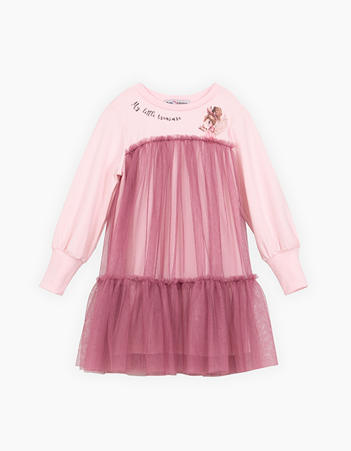 Романтичное платье с длинным рукавом для девочки. Игра цветов на оттенках розового. Модель комфортного А-образного силуэта с высокими манжетами. Платье из комбинации материалов: кулирная гладь и сетчатое полотно. Альтернатива комплекту из лонгслива и юбки