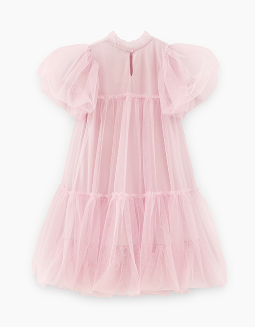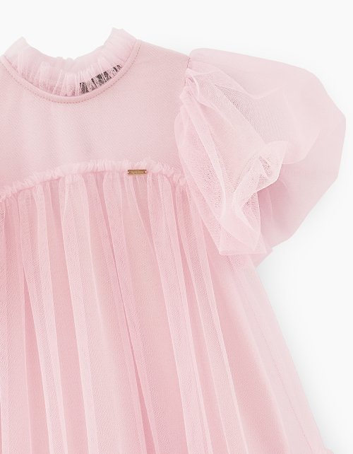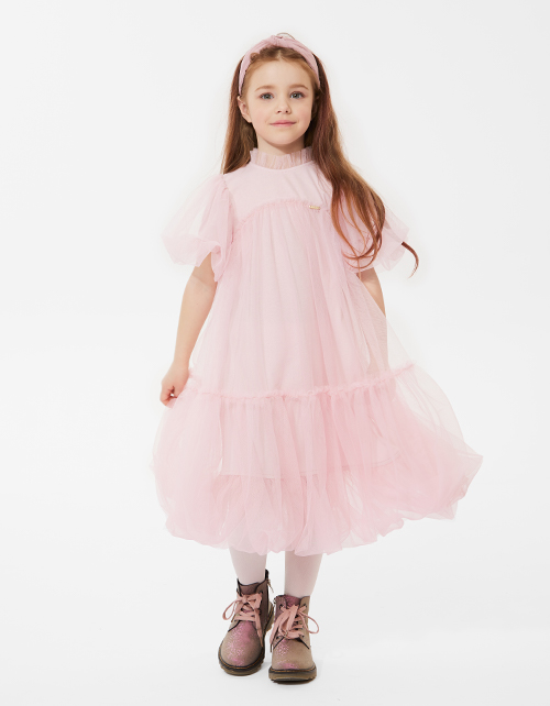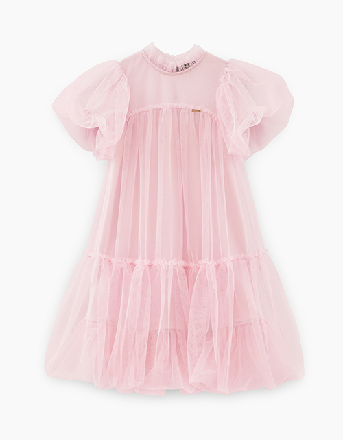 Стильное платье выполнено в трендовом оттенке хрустальная роза. Модель А-образного удлиненного силуэта декорирована нашивками. Удобная застежка по спинке на пуговицу и с коротким рукавом.