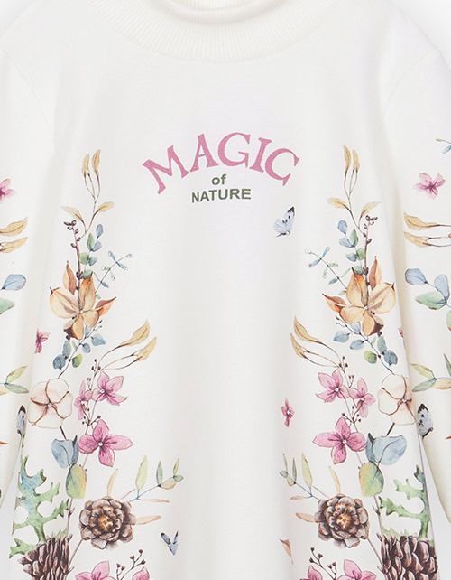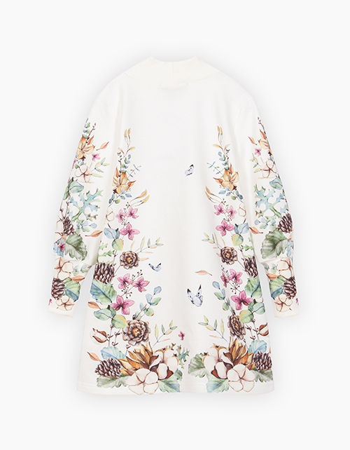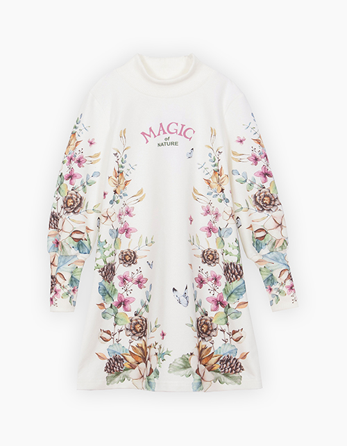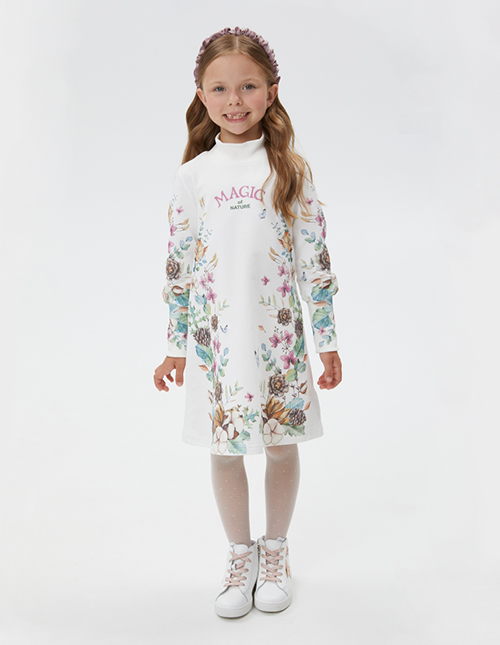 Платье с длинным рукавом для девочки. Модель комфортного А-образного силуэта, без застёжки. Высокие манжеты и горловина-стойка из рибаны. Платье декорировано стразами и фантазийным дизайнерским принтом.